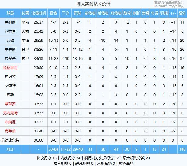 湖人(主队):东契奇37分5板10助4断、里夫斯26分5板1助、艾顿20分14板1助、拉拉维亚16分4板2助、詹姆斯11分3板12助、海斯8分3板、八村塁6分4板1助、文森特6分1助、斯玛特5分3板1助